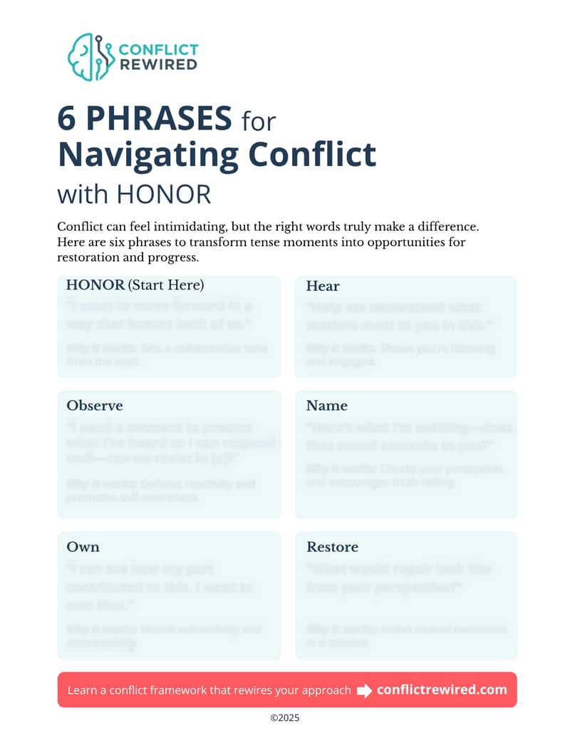 This 1-page guide gives you 6 simple, practical phrases based on my HONOR Framework for navigating conflict that you can use right away to: